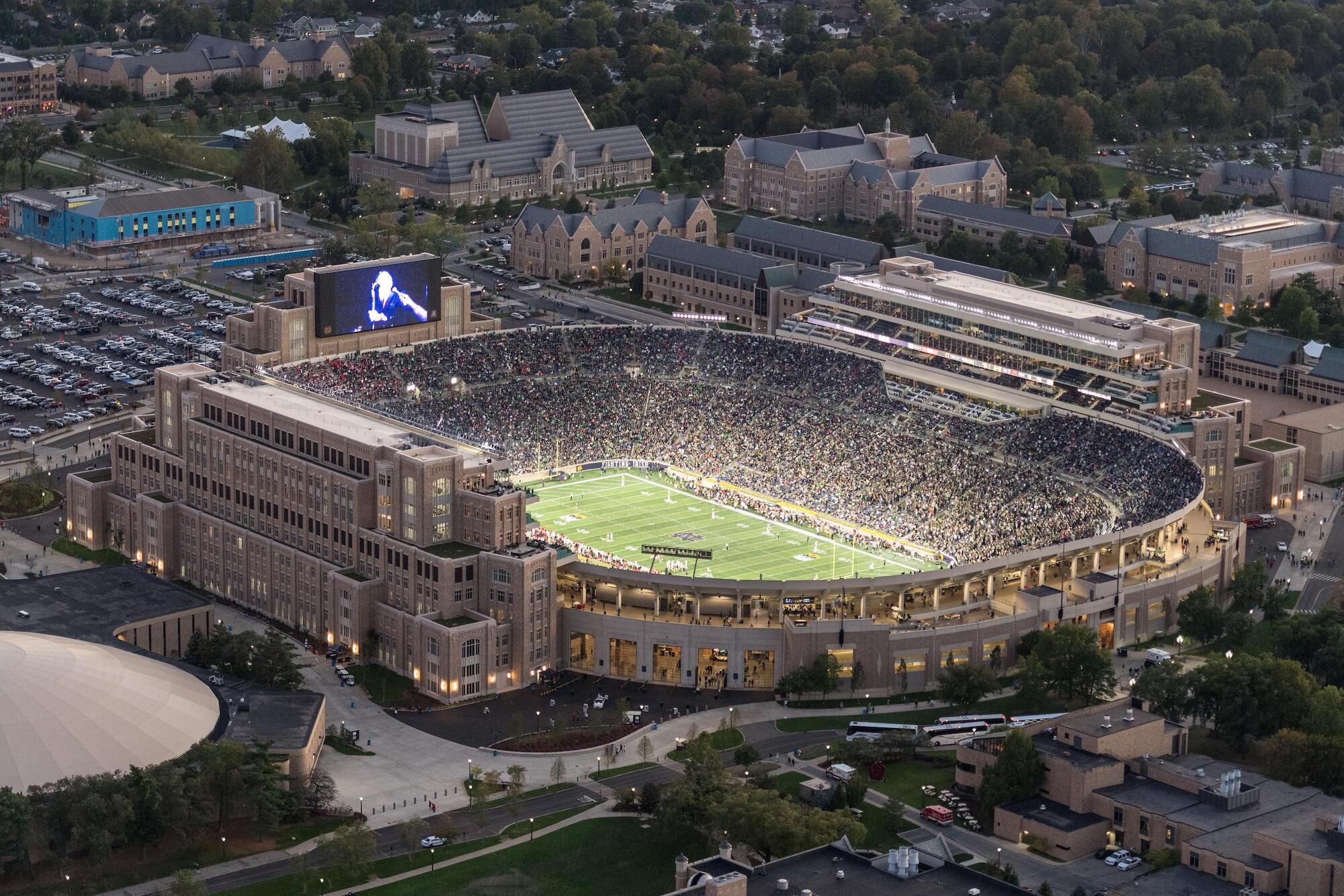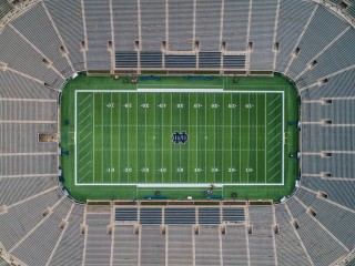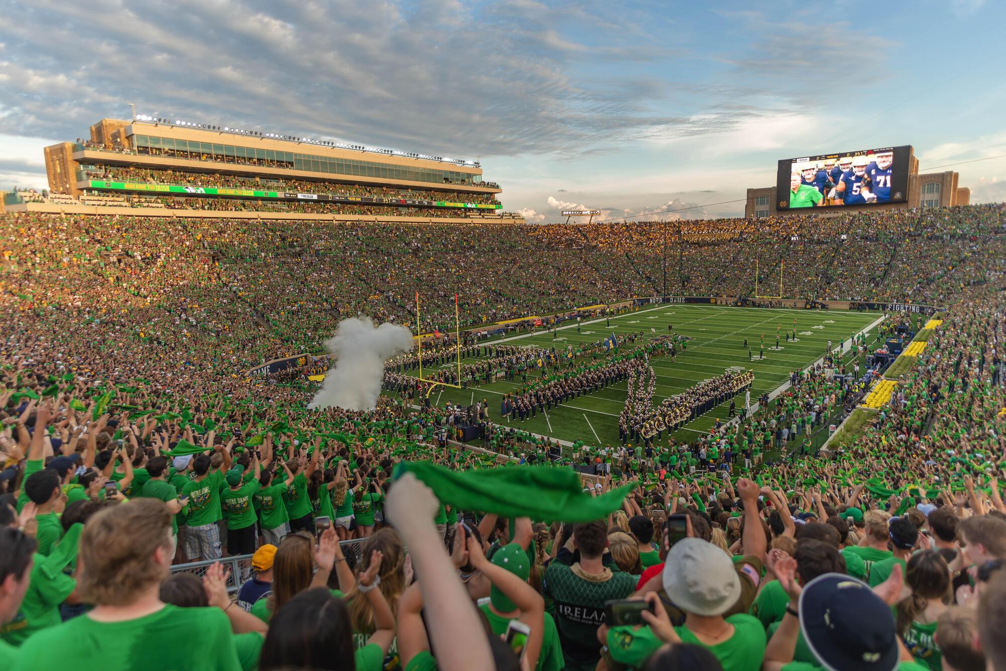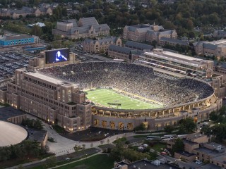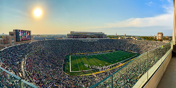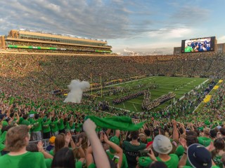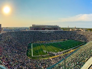 Home to the legendary Notre Dame Fighting Irish football, Notre Dame Stadium is one of college football’s most iconic destinations. Built in 1930 and designed by famed coach Knute Rockne, the stadium carries nearly a century of tradition. The stadium later expanded to seat over 80,000 fans for today’s unforgettable game-day atmosphere. From the moment you arrive, you’re swept into the energy of a true football pilgrimage, where students, alumni, and visitors come together in a sea of blue, gold and green.