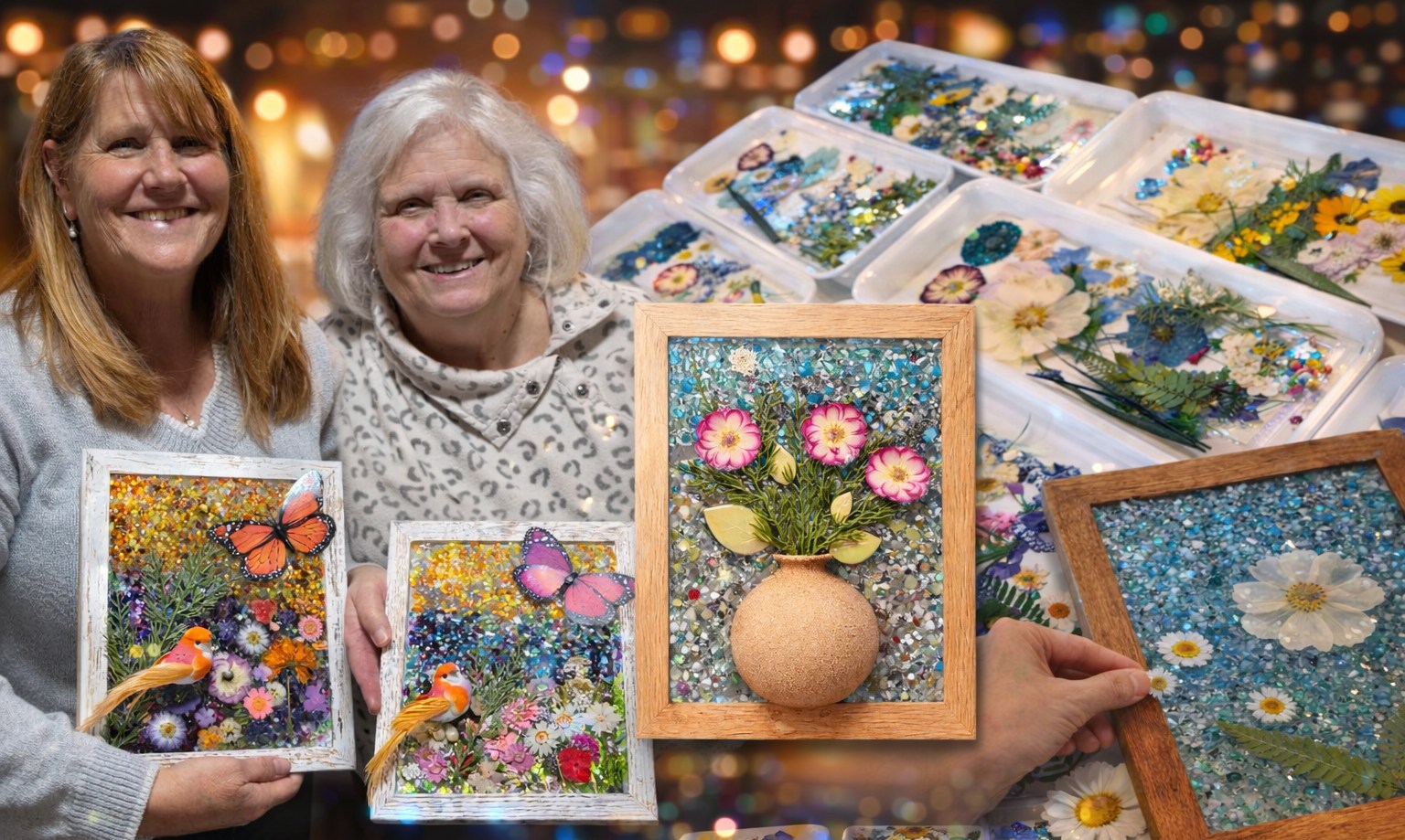 Create a sparkling 8×10 Glimmer Frame using colorful crushed glass, 3D embellishments, and glossy resin. No experience needed, we guide you step-by-step so you can relax and enjoy the experience.